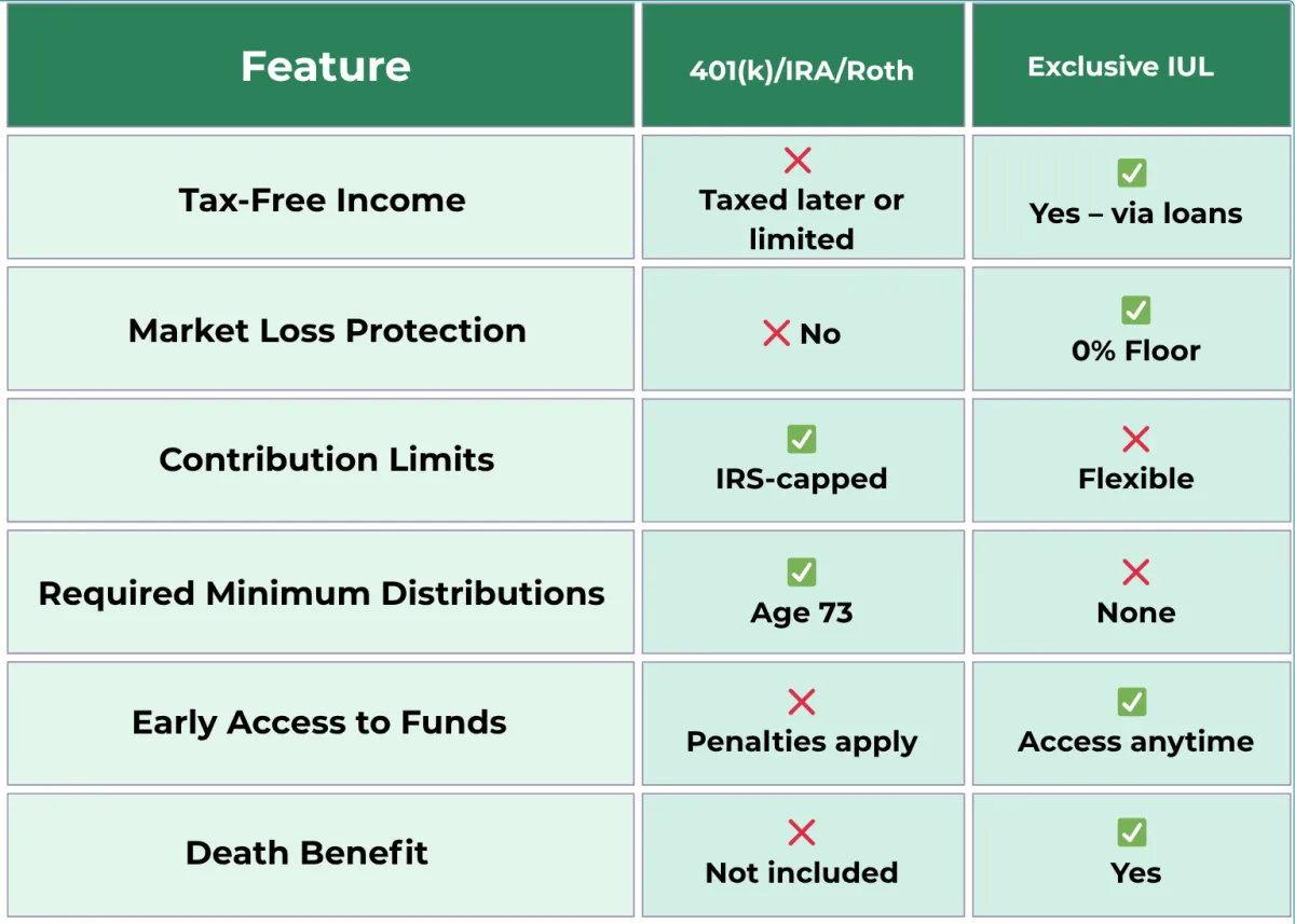 See why this strategy outperforms traditional retirement accounts when it comes to taxation, access, liquidity, and growth — without market losses.